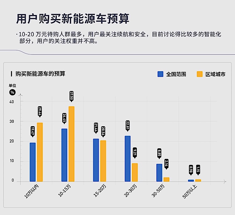 在全国范围内,预算在10万-20万元区间内的新能源车用户占比达到47.89%;在北京、上海、石家庄、青岛、南京、杭州、苏州等7大重点区域市场上,相关用户占比则达到58.06%。