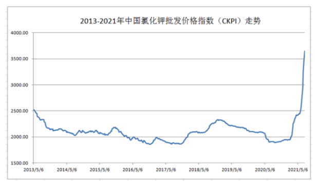 中国农资流通协会发布监测数据显示,7月19日中国氯化钾批发价格指数(CKPI)为3647.72元/吨,相比6月初上涨1111.76元/吨,涨幅为43.84%;同比上涨1738.4元/吨,涨幅为91.05%。