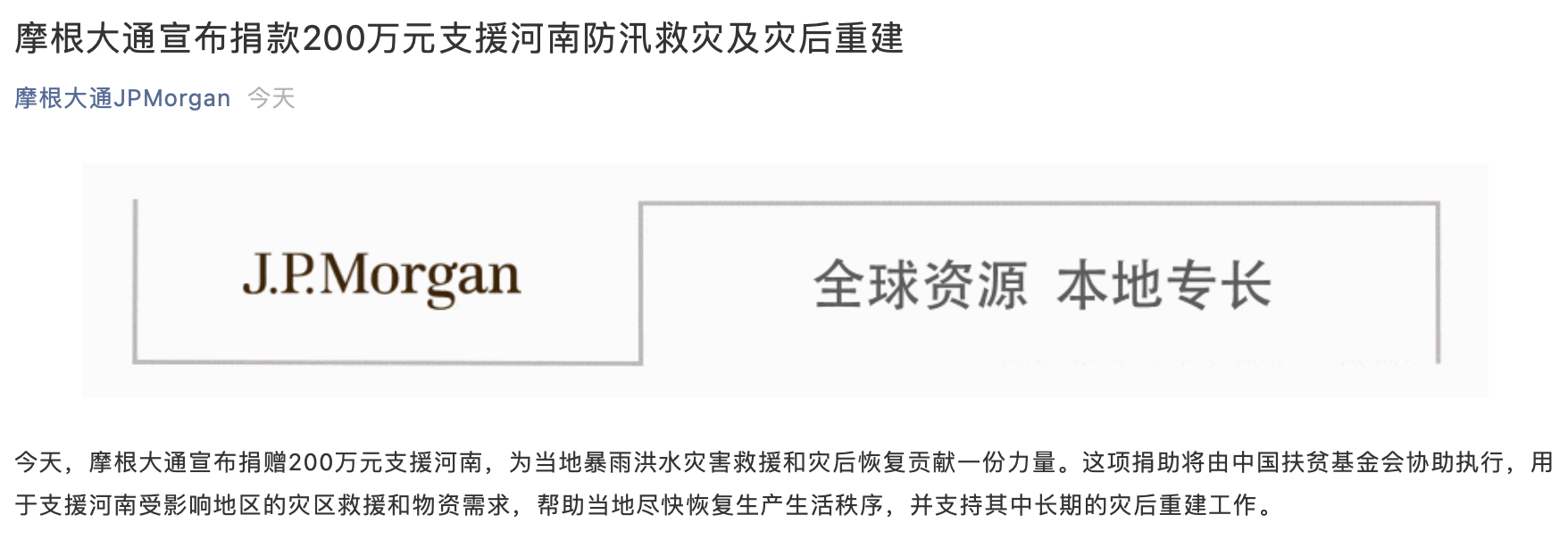 据“摩根大通JPMorgan”微信公众号7月30日消息,今天,摩根大通宣布捐赠200万元支援河南,这项捐助将由中国扶贫基金会协助执行,用于支援河南受影响地区的灾区救援和物资需求,帮助当地尽快恢复生产生活秩序,并支持其中长期的灾后重建工作。