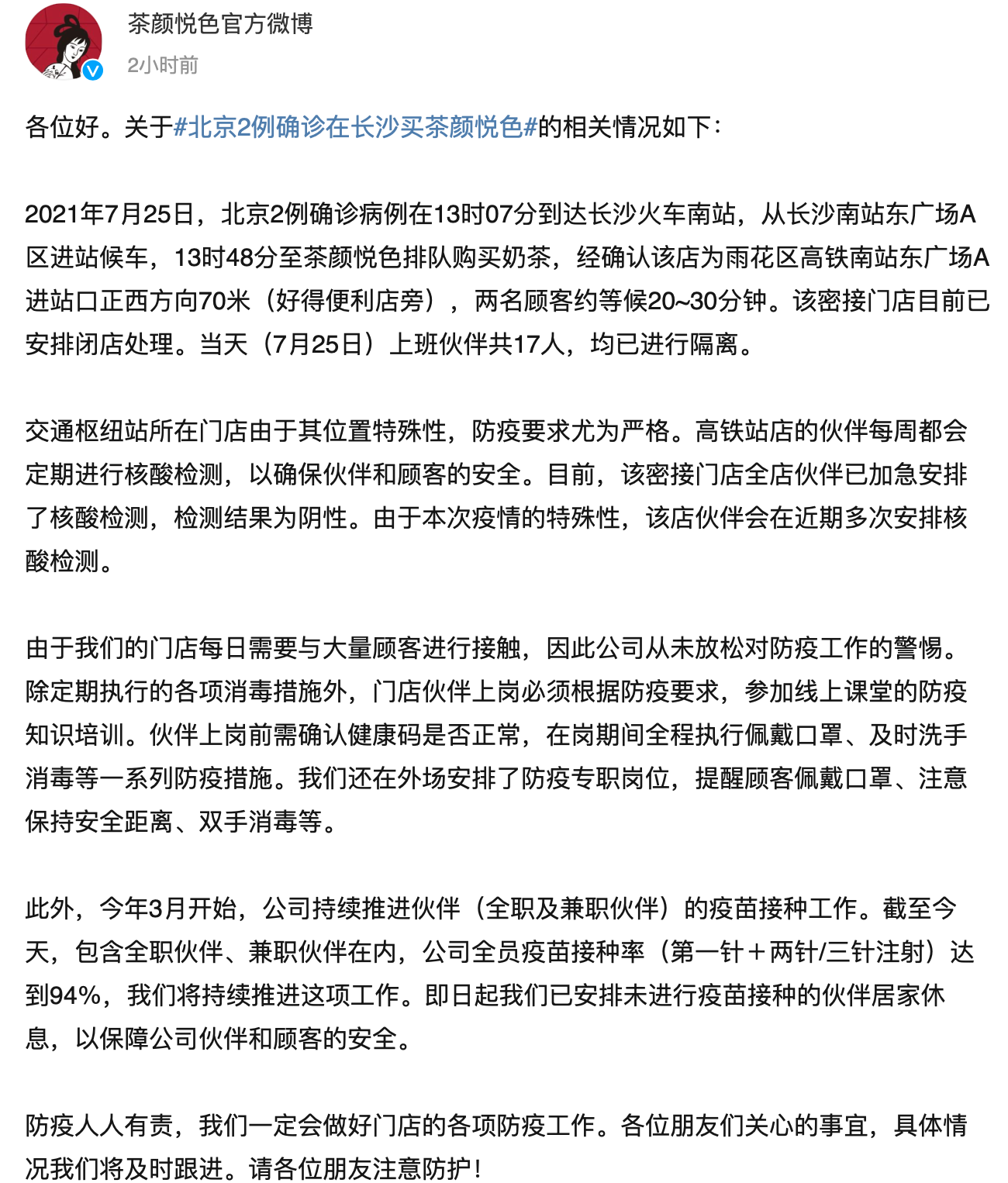 7月30日,@茶颜悦色官方微博 发文回应关于北京2例确诊在长沙买茶颜悦色的相关情况。茶颜悦色表示,该密接门店目前已安排闭店处理,当天(7月25日)上班员工共17人,均已进行隔离。目前,该密接门店全店员工已加急安排了核酸检测,检测结果为阴性。由于本次疫情的特殊性,该店员工会在近期多次安排核酸检测。
