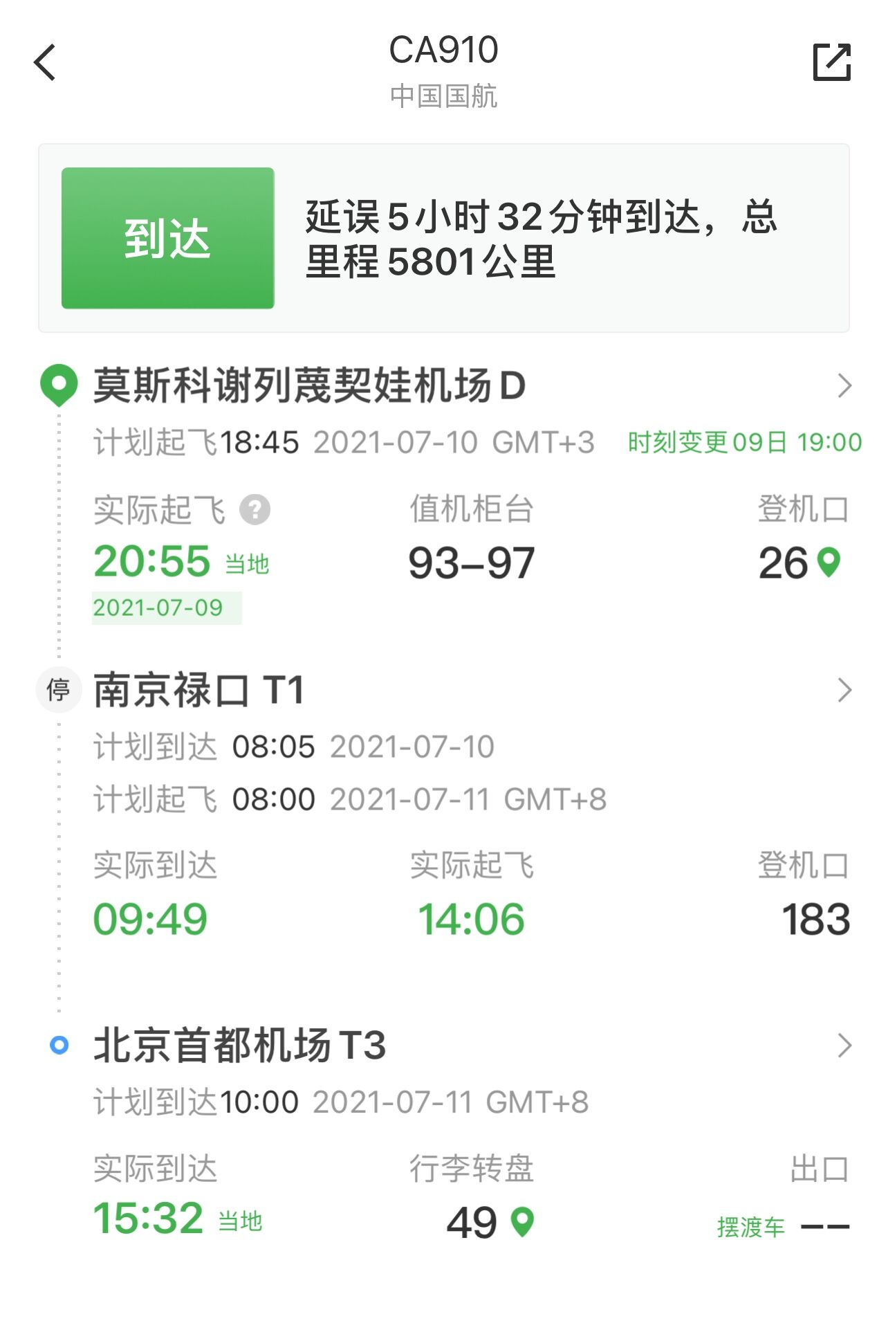 界面新闻记者查询到,当地时间7月9日晚上20:55,国航CA910航班从莫斯科谢列梅捷沃机场起飞,于北京时间7月10日早上9:49分降落在南京禄口机场T2。
