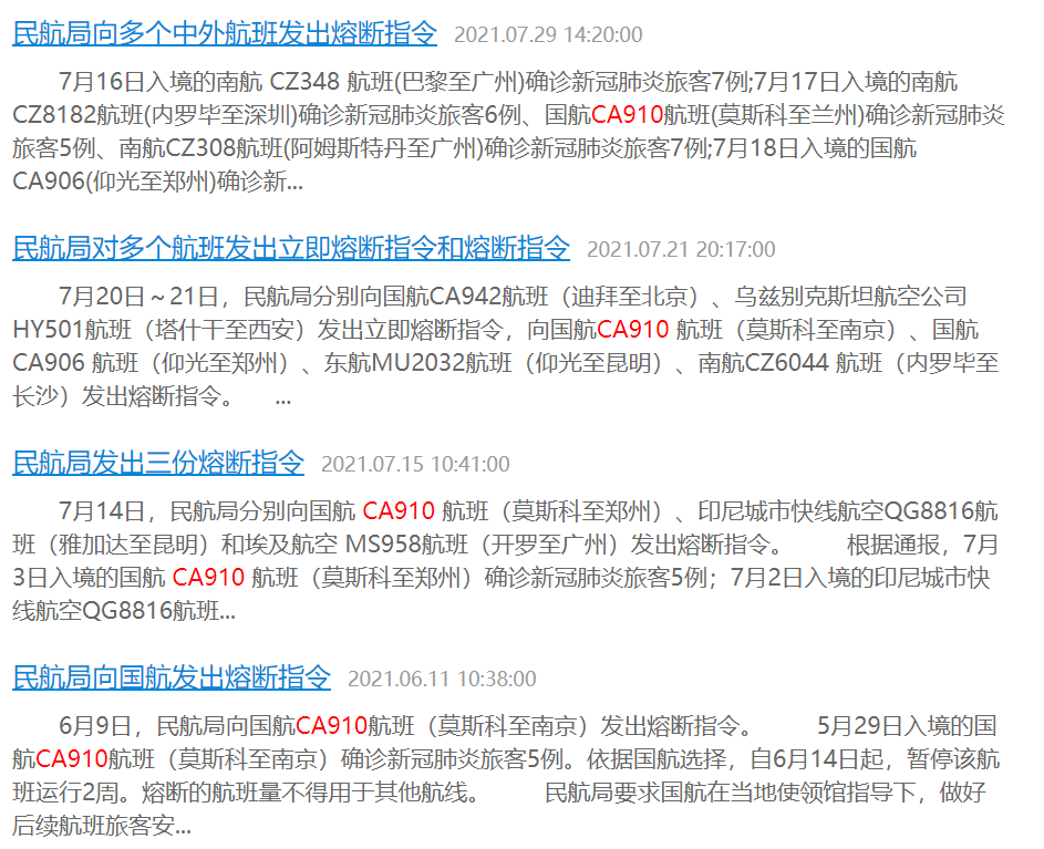 7月21日,民航局再次通报,7月10日入境的国航CA910航班(莫斯科至南京)确诊新冠肺炎旅客7 例,自8月2日起,继续暂停国航CA910航班运行2周。