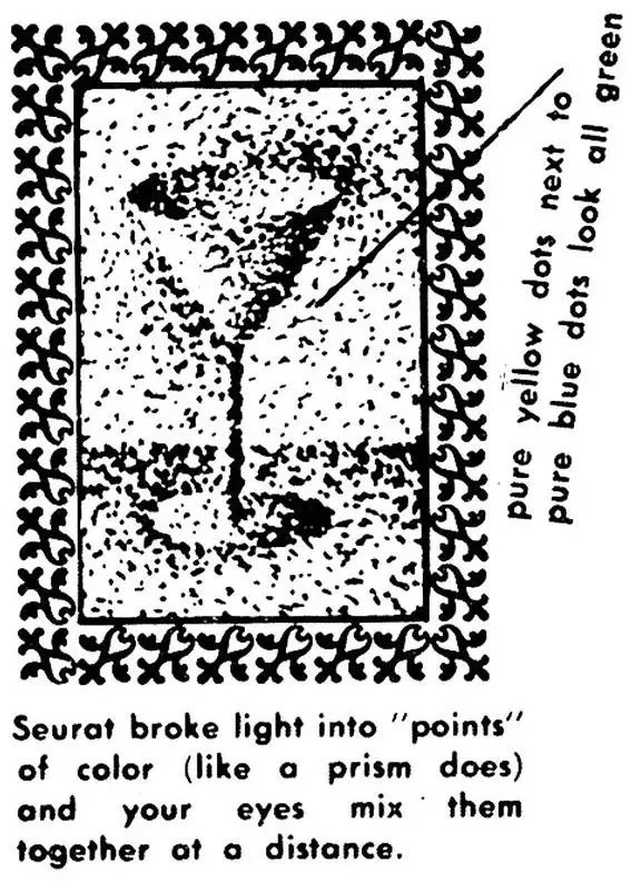 技法:纯黄色的点旁边就是纯蓝色的点,看上去就是绿色的。