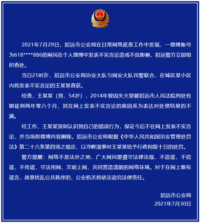 招远公安通报:2021年7月29日,招远市公安局在日常网络巡查工作中发现,一微博账号为618****886的网民在个人微博中发表不实言论造成不良影响,招远警方立即组织查处。