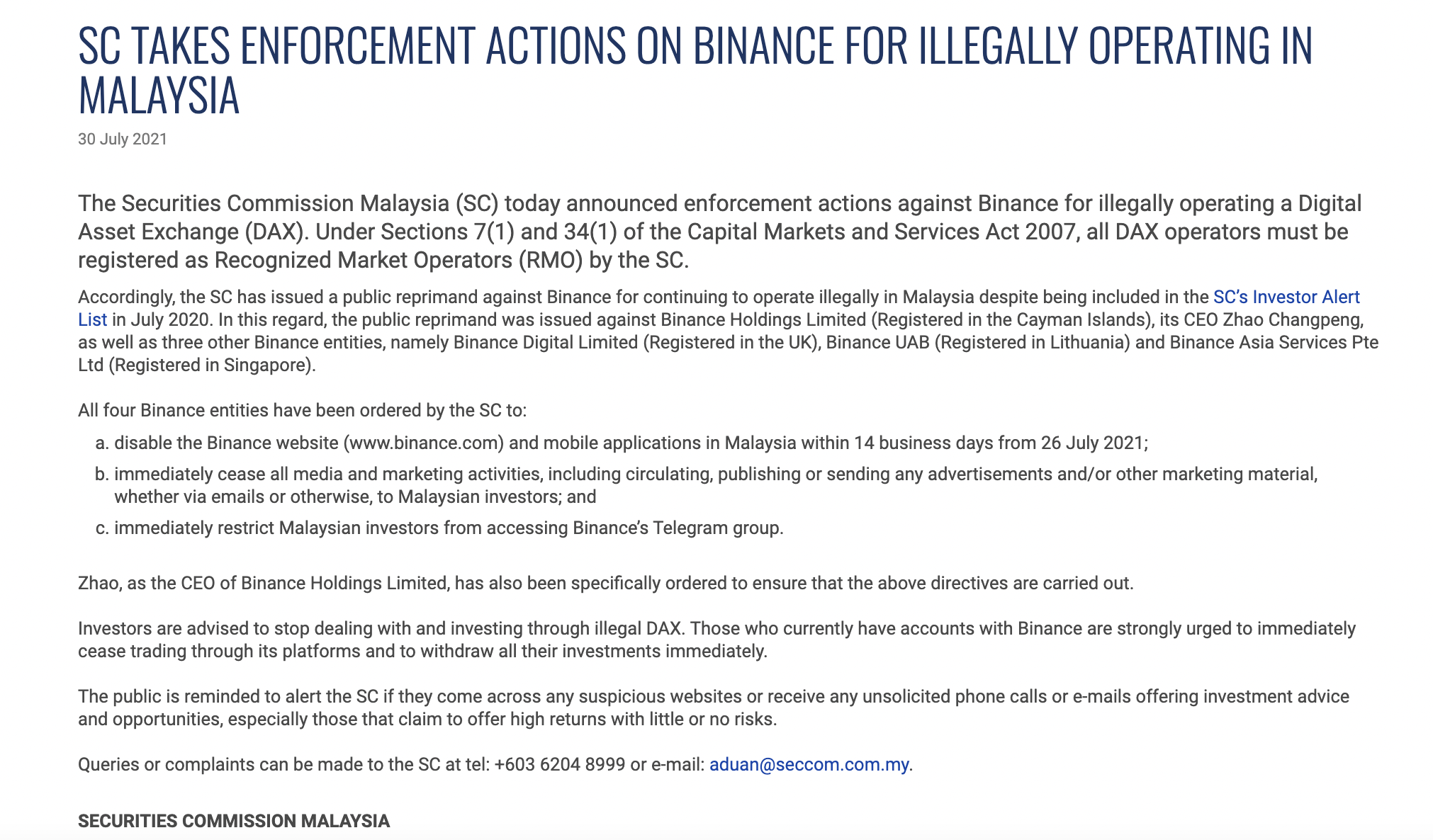7月30日,马来西亚证券委员会发布公告,要对在当地非法运营的数字资产交易所(DAX)币安采取强制措施。