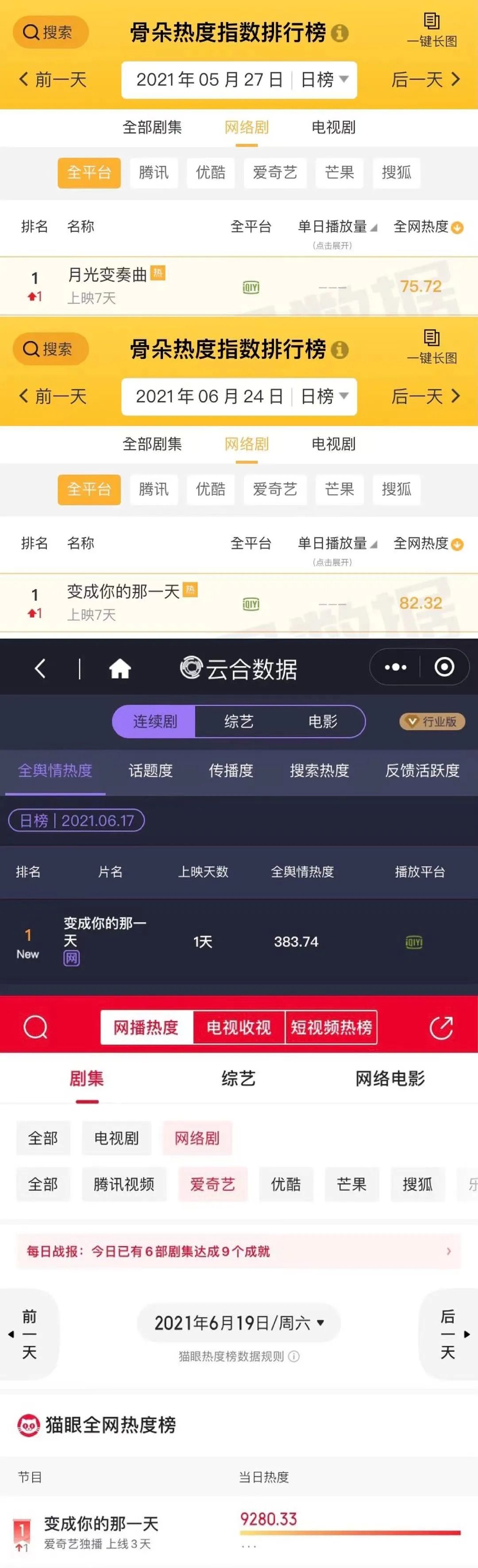 而最近热播的恋恋剧场,不仅有刚刚上线的《循环初恋》以“回到未来”式的奇想设定迅速引起市场关注,更有之前表现突出的《月光变奏曲》和《变成你的那一天》,长期霸榜爱奇艺热播榜前五,连续多日位列骨朵、猫眼、云合数据等第三方剧集榜首位。每当一部剧临近收官,就有观众带上#恋恋剧场#微博话题催更下一部,追剧热情可见一斑。