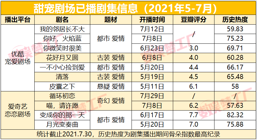 今年5月,爱奇艺面向年轻观众官宣了“100%全糖”的恋恋剧场,而去年上线的优酷宠爱剧场也在当月推出了新片单,甜宠剧升级为剧场化运营,成为“兵家必争之地”。