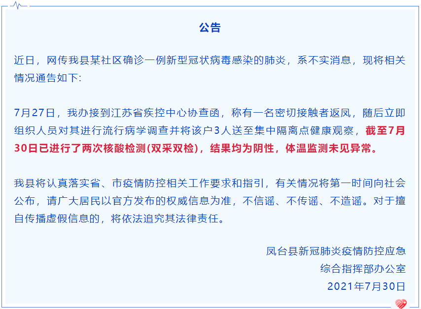据“安徽发布”消息,7月30日,凤台县新冠肺炎疫情防控应急综合指挥部办公室发布公告,近日网传凤台县某社区确诊一例新型冠状病毒感染的肺炎,系不实消息。7月27日,凤台县接到江苏省疾控中心协查函,称有一名密切接触者返凤,随后立即组织人员对其进行流行病学调查并将该户3人送至集中隔离点健康观察,截至7月30日已进行了两次核酸检测(双采双检),结果均为阴性,体温监测未见异常。