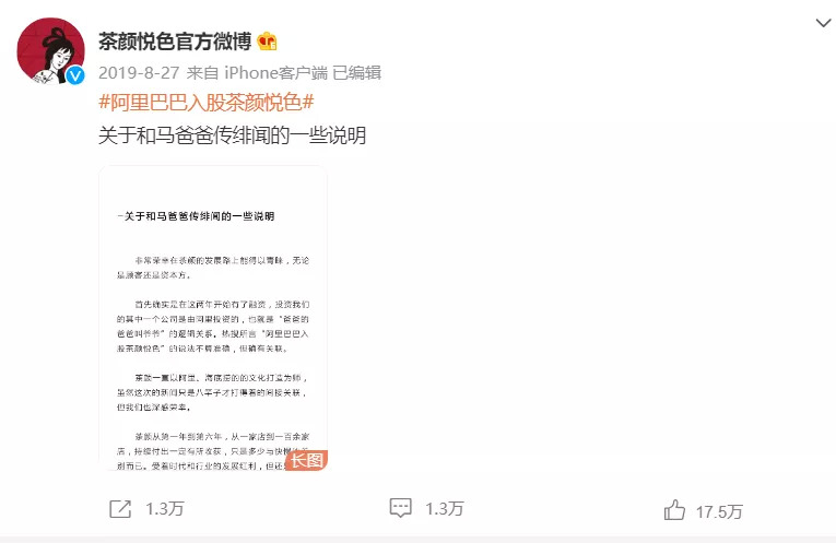 在A轮融资前,茶颜悦色还因“阿里入股”传闻登上热搜。但随后,茶颜悦色官方表示,投资茶颜悦色的其中一家公司由阿里投资,因此“阿里巴巴入股茶颜悦色”的说法不算准确,但确实有关联。