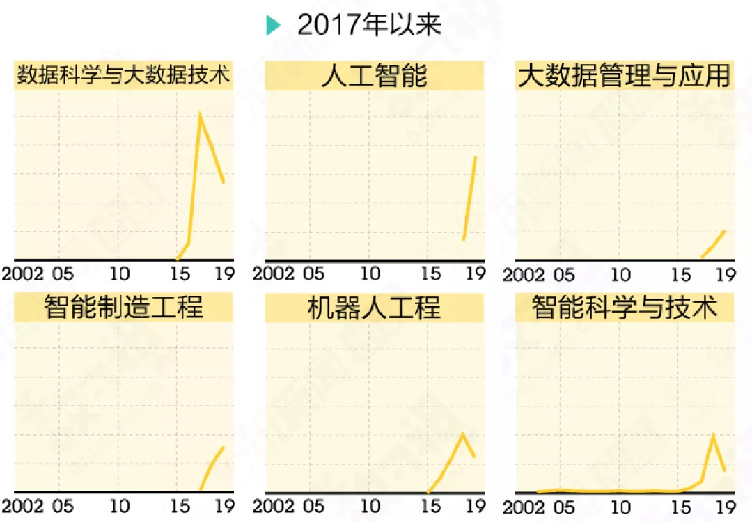 谷雨数据统计的2017年以来新增热门专业量显示,国内高校正高速增设大量AI、大数据方向相关专业,人才供求差距缩小,势必影响未来行业的薪资水平。