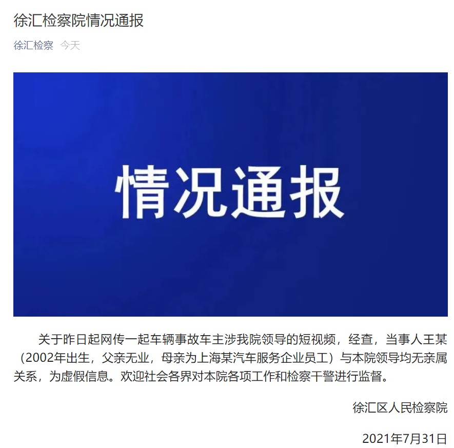 据上海“徐汇检察”7月31日消息,关于昨日起网传一起车辆事故车主涉徐汇区人民检察院领导的短视频,经查,当事人王某(2002年出生,父亲无业,母亲为上海某汽车服务企业员工)与该院领导均无亲属关系,为虚假信息。欢迎社会各界对本院各项工作和检察干警进行监督。