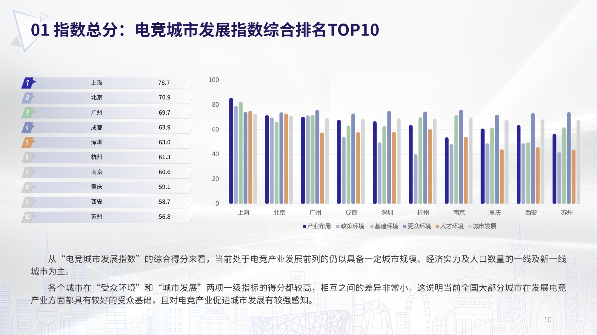 《2020年度全国电竞城市发展指数评估报告》显示,“电竞城市发展指数”的综合得分排名,上海以78.7分位居第一,其次是北京、广州、成都和深圳。