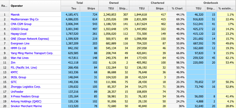 从整体运力排名来看,马士基依旧位列第一,总运力达4,185,471TEU,运营船舶总数724艘。MSC位居第二, 总运力为4,083,371TEU,运营船舶总数613艘。达飞集团位居第三位,总运力3,006,344TEU,运营船舶总数543艘。中远航运、赫伯罗特、海洋网联船务公司ONE、长荣海运等紧随其后。