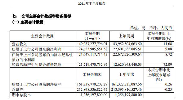 7月30日晚,贵州茅台披露了半年报。财报显示,这家公司营收同比增长11.68%;归母净利润同比增长9.08%,相比2020年同期归母净利润增速13.29%下滑了4.21个百分点。