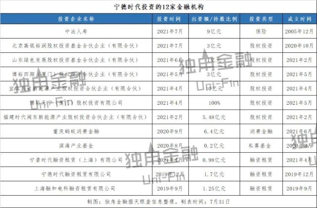 宁德时代两年内至少投资了12家金融机构,成为蚂蚁消费金融、中法人寿、滨海产业基金、3家资融资租赁公司、6家股权投资公司的股东。