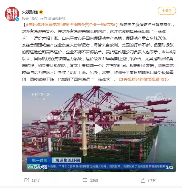 据央视财经报道,青岛至美国线路,(原先)基本上超高集装箱的运价在3000美元(约1.9万人民币)左右,现在疫情之后,市场价在16000美元(约10.33万)左右。甚至存在“一箱难求”,此种情况下,企业有订单也不敢接了。