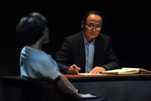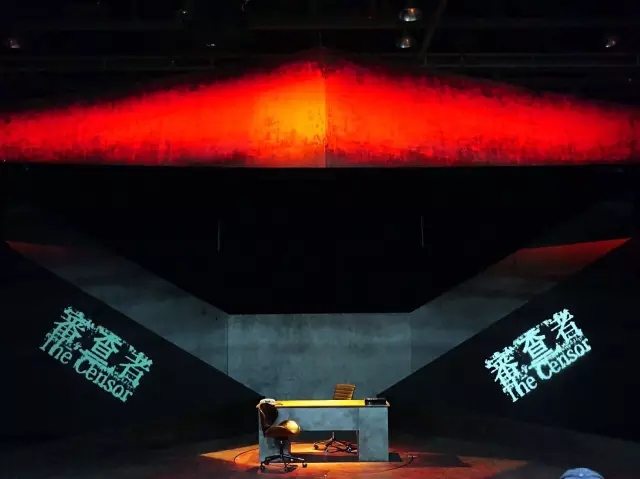 不得不说,此戏的导演手法简练而充满现代感,电子乐配合着舞台侧屏的使用,将审查者对色情片分镜头的详细标注,自下而上滚动了出来,并流溢到了整个舞台,给人一种目眩神迷的眩晕感。转台的使用,使得舞台的调度流畅自然,尤其是当坐在办公桌前的审查者,跟随转台缓慢自前向后背对观众时,四周光收,只有一束昏黄的灯光打在审查者身上,你会诧异,这是一个坐在地窖中,背对着你的男人,这种瞬间营造出的视觉画面,会让人不由产生一种幽暗的恐惧感。舞台中区上方隔出的露天阳台,是审查者妻子偶尔闪现的地方,她面无表情的脸,声音低沉而空洞,虽然死寂一样的站在那里,但却能让你分明能感受到她的内心在尖叫!尖叫,是在一个压抑世界里,人,唯一能发出的声音。