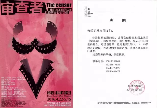 就在我写这篇戏评的几个小时前,从朋友那得知《审查者》被审查了,果不其然,随即便看到了鼓楼西剧场发表的声明: