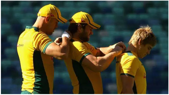 澳大利亚Wallabies橄榄球队员互相帮助固定跟踪设备
