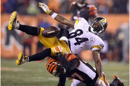 一名辛辛那提孟加拉虎队球员对抗一名匹兹堡钢人队接球员