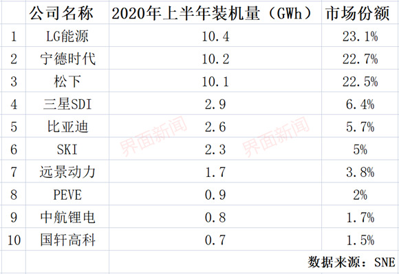 上述六家公司的市场份额因此较去年同期提高,松下、三星SDI、远景动力和PEVE四家的市占率则出现缩水。远景动力是远景科技集团旗下的电池生产商;PEVE为丰田汽车旗下的电池公司。