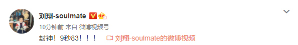 雅典奥运会110米栏金牌得主、中国田径名将刘翔在微博发文祝贺苏炳添:“封神!9秒83!!!”