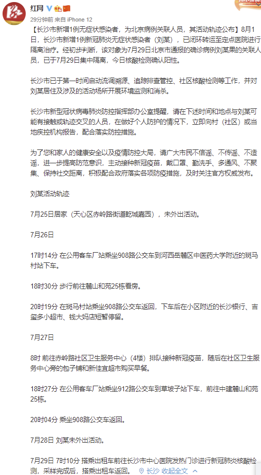@红网 微博消息,8月1日,长沙市新增1例新冠肺炎无症状感染者(刘某),已闭环转运至定点医院进行隔离治疗。经初步判断,该对象为7月29日北京市通报的确诊病例刘某果的关联人员,已于7月29日集中隔离,今日核酸检测确认阳性。