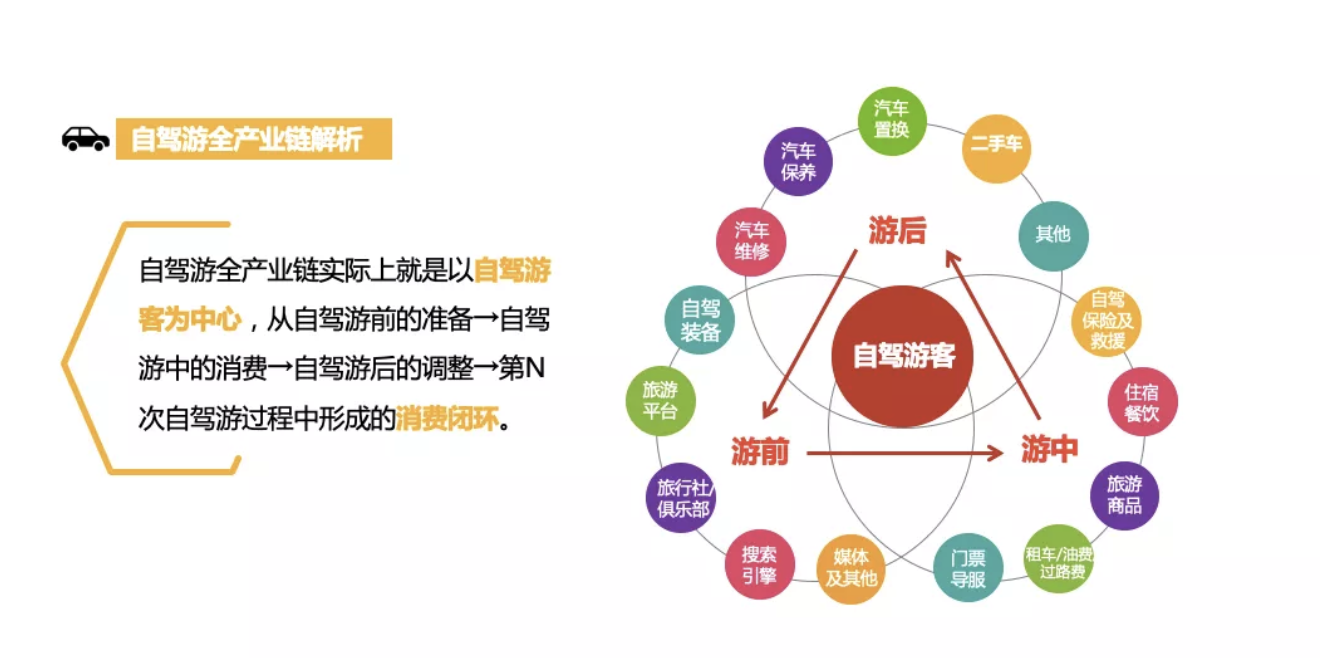 新旅界在采访中发现,自驾游产业链条极长,没有任何一家企业能覆盖全产业链条,包括:1)自驾游前的因“信息获取、旅游预订、所需自驾装备”等方面消费所涉及的“自驾装备、旅游平台、旅行社/俱乐部、搜索引擎和媒体”等产业板块;2)自驾游中的旅游产品消费所涉及的“租车、自驾保险及救援、住宿、餐饮、旅游商品、油费、过路费、停车费、门票、导服等产业板块;3)自驾游后汽车类服务消费所涉及的“汽车维修、汽车保养、汽车置换和二手车”等产业板块。