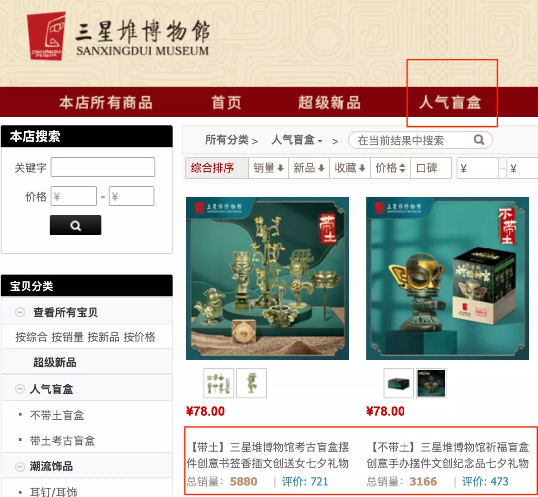 现在,潮流玩具几乎成了博物馆文创产品中常见的产品类型,部分博物馆旗舰店在商品分类里,特别辟出了盲盒类产品。如,三星堆博物馆的人气盲盒里,考古盲盒7月单店销售近6000件。