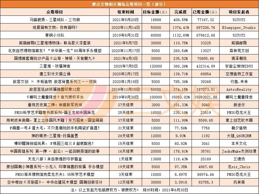 这两个众筹,是三文娱随机在摩点统计的22个文物相关的潮玩模型众筹项目中的两个。22个项目中,已结束众筹的项目有13个,全部完成众筹。