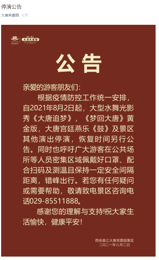 8月2日,大唐芙蓉园在其微信公众号发布公告称:根据疫情防控工作统一安排,自2021年8月2日起各项演出停演。
