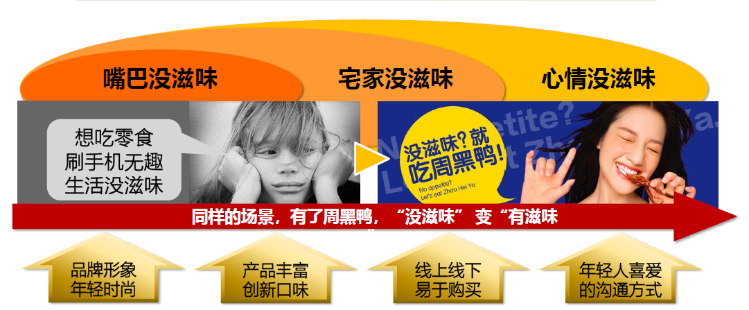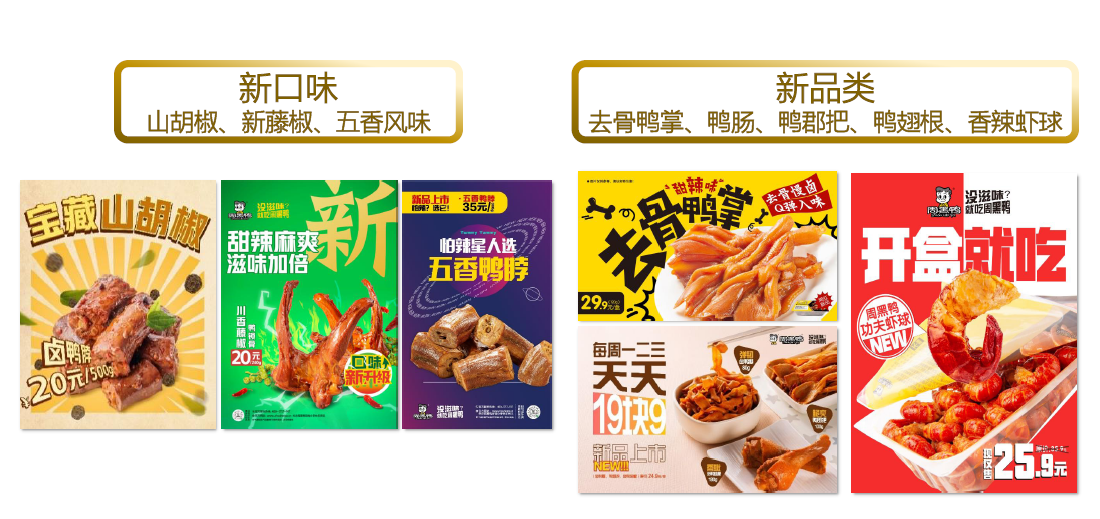 面向年轻的消费者群体,周黑鸭还喊出“没滋味,就吃周黑鸭“的口号,目标就是想让年轻的消费者的生活变得有滋有味。因此,周黑鸭不断加大新品的开发,捕捉不同热点,通过洞察顾客的需求动态去获取市场需求。