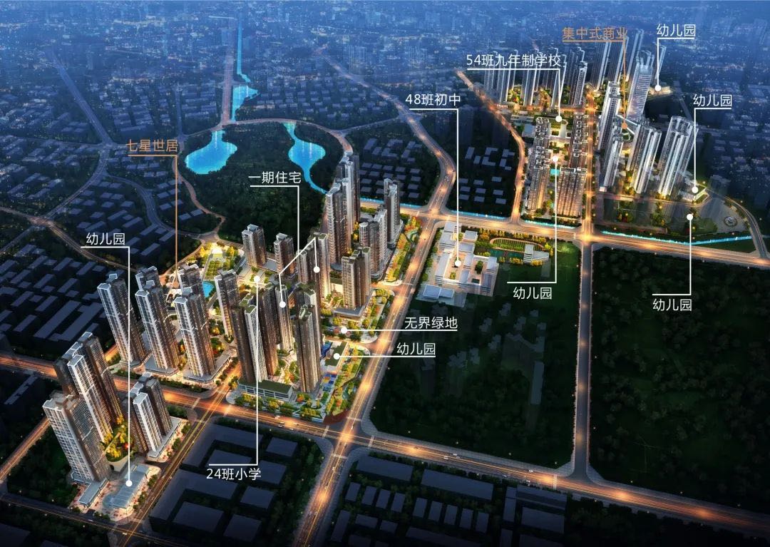 项目自带6所9-12班幼儿园,1所24班小学,1所48班初中,1所54班九年一贯制学校。