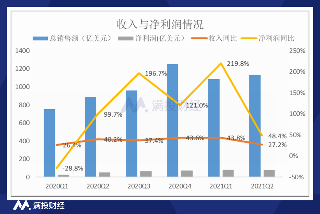 7月30日,亚马逊(AMZN.US)发布了截至2021年6月30日第二季度财务报告。财报显示,亚马逊二季度实现总销售收入为1130.8亿美元,同比增长27.2%,低于市场预期的1150.6亿美元;二季度的净利润为77.8亿美元,同比增长48.4%,同样低于市场预期的85.7亿美元。亚马逊的总收入和净利润双双低于市场预期,具体表现如何?以下来为大家解读亚马逊的财务数据,简单分析亚马逊二季度的经营情况。