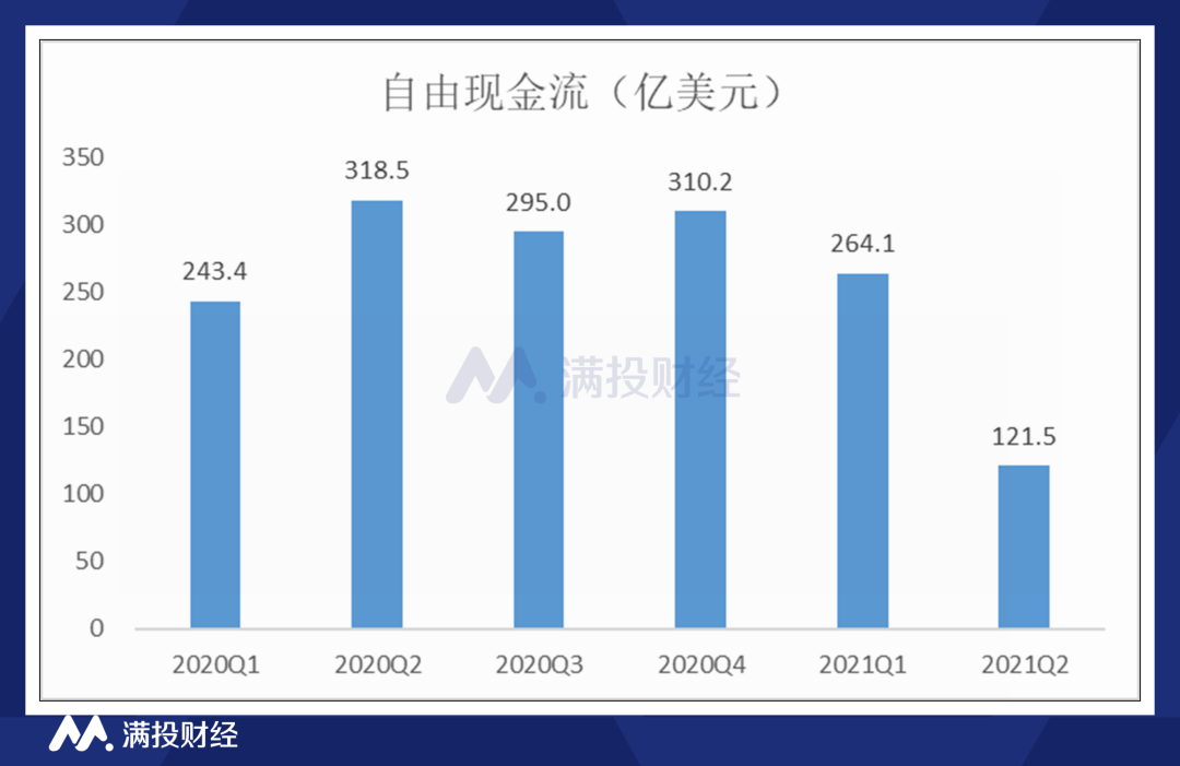 最后来看亚马逊的现金流情况。截至2021年6月30日,亚马逊的自由现金流为121.5亿美元,与去年同期的318.5亿美元相比仅剩下三成多,降幅高达62%。与上季度264.1亿美元相比,本季度的自由现金流不足一半。
