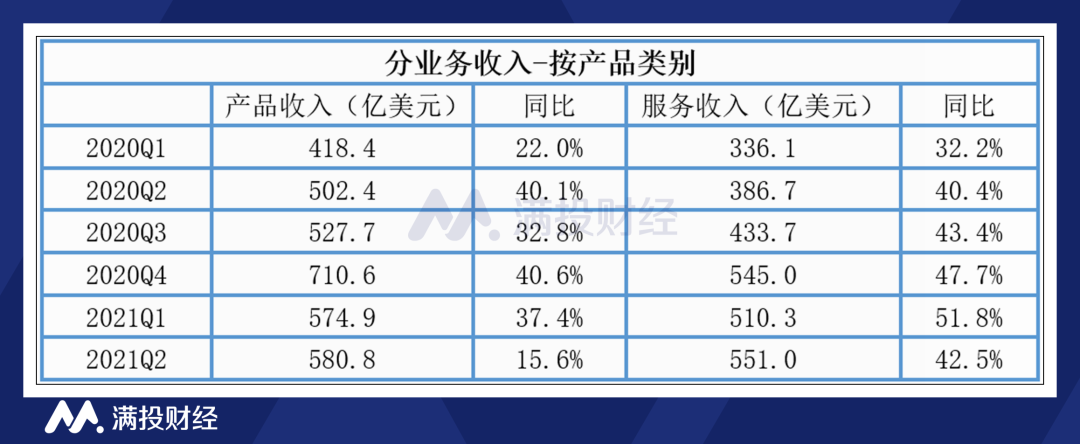 再来看亚马逊分业务的表现情况。按照产品类别,亚马逊的收入来源于两部分,销售产品收入和服务收入,产品的收入超过50%,略高于服务收入。二季度,亚马逊的产品收入为58.8亿美元,同比增长15.6%,增速创六个季度以来的新低,这也是造成亚马逊总收入增速下滑的主要原因;二季度,亚马逊的服务收入为551亿美元,同比增长42.3%,服务收入的表现相对稳定。