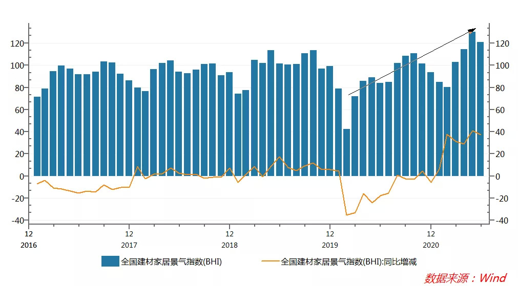 得益于国民经济的持续向好与国内形势的整体稳定,家居行业表现全面回暖。根据国家统计局数据,今年上半年,我国家具类零售额累计值为781亿元,同比增长30%,相对去年同期提升了44个百分点;与此同时,自今年3月份以来,全国建材家居景气指数(BHI)就一直处在100以上的景气区间内,其中5月和6月高达130.03和120.99,同比分别上涨了40.9点和37.14点(见下图)。充分反映出市场上的家居消费需求已开始再度释放。