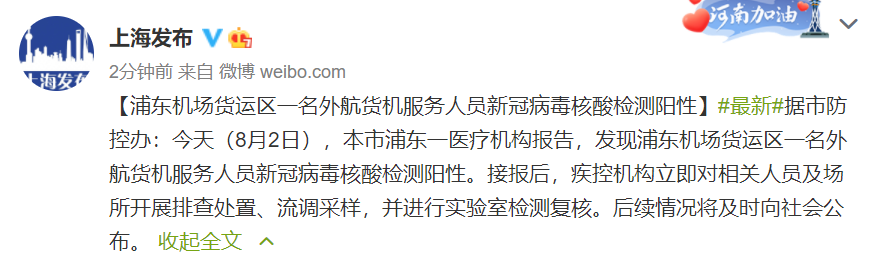 据@上海发布 微博消息,据市防控办:今天(8月2日),本市浦东一医疗机构报告,发现浦东机场货运区一名外航货机服务人员新冠病毒核酸检测阳性。接报后,疾控机构立即对相关人员及场所开展排查处置、流调采样,并进行实验室检测复核。后续情况将及时向社会公布。