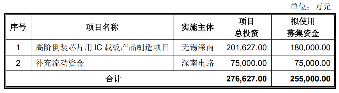 据悉,深南电路计划向不超过35个特定投资者募资不超过25.5亿元,募资除了补充流动资金7.5亿元之外,剩余将投入“高阶倒装芯片用IC载板产品制造项目”,其中,关联方中航产投拟以现金方式认购此次非公开发行股票金额1.5亿元。