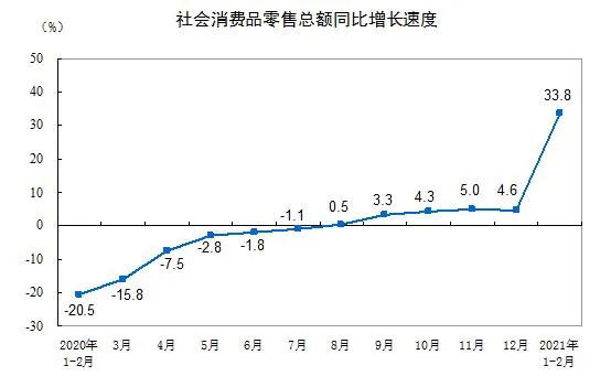 所幸的是,2020年下半年中国零售业的增速转正,特别是四季度同比增幅达4.6%。2021年2月增幅高达33.8%!