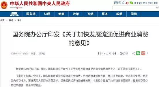 除了《城市一刻钟便民生活圈建设指南》之外,在2019年8月27日,国务院办公厅就印发了《关于加快发展流通促进商业消费的意见》(以下简称《意见》)。