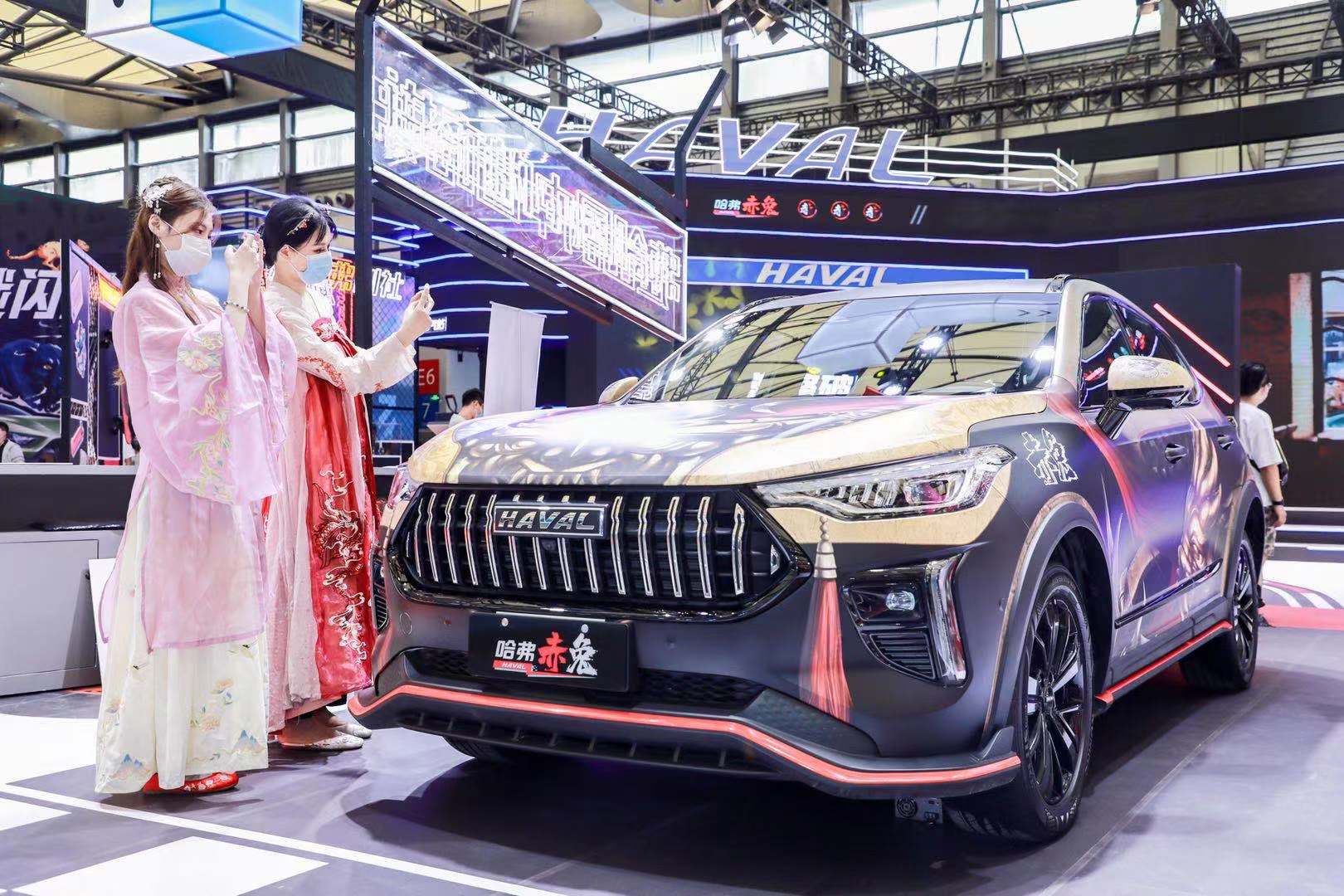 同样玩痛车,哈弗在E6展区摆出了两台走纯原创国潮路线的痛车——一款是走京剧风的哈弗赤兔,另一款是将潮玩属性、涂鸦文化、以及哈弗一贯持有的硬汉力量相结合的哈弗大狗。除了弹眼落睛的痛车,哈弗品牌还在展区一起展出与车型名字,痛车图案相呼应的涂鸦T恤、手办等完整的跨界周边产业链。