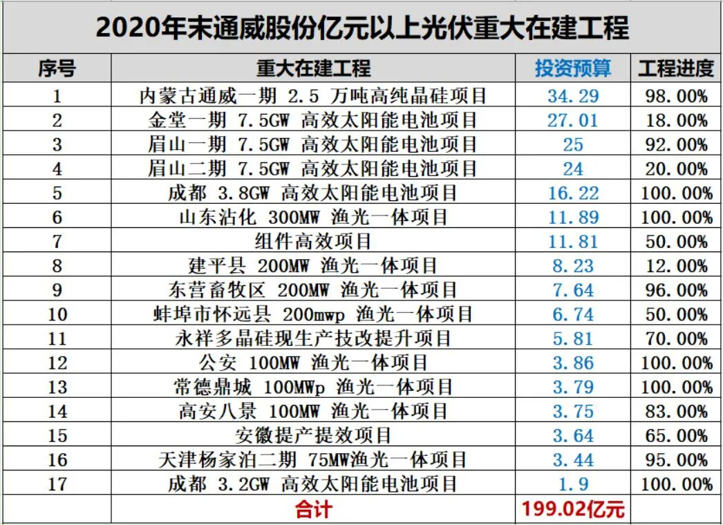 事实上,通威股份很多重大在建工程也都进入收官阶段。据黑鹰光伏统计,截止2020年末,通威股份有17个亿元以上的光伏重大在建工程,总投资预算达199.02亿元,其中14个项目的工程进度在50%以上,10个项目工程进度超过80%。