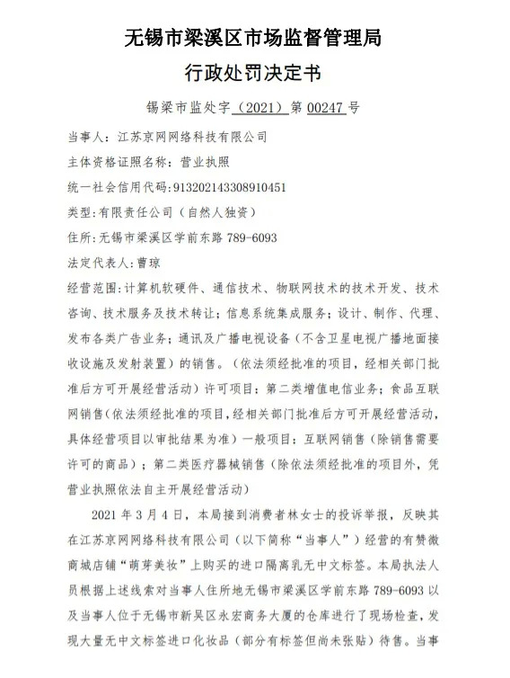 近日,无锡市梁溪区市场监督管理局发布一则行政处罚决定书,行政处罚决定书显示,有赞微商城店铺“萌芽美妆”运营方——江苏京网网络科技有限公司被查封的涉案48箱无中文标签进口化妆品(含尚未加贴中文标签化妆品)中,有 21 箱确系无中文标签,经营标签不符合《化妆品监督管理条例》规定的进口化妆品货值金额合计 214301.72 元。针对“萌芽美妆”标签不合规的违法行为,无锡市梁溪区市场监督管理局罚没“萌芽美妆”运营方百万元。