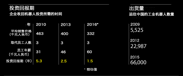 每年,企业收回机器人投资所需的时间——即“投资回报期”——都会大幅缩短,使自动化投资对中国小企业和工厂具有更大吸引力。以中国汽车制造业为例,花旗分析师的计算显示,2010年到2015年,焊接机器人的投资回报期已从5.3年降至1.7年。到2017年,投资回报期预计会降至仅1.3年。