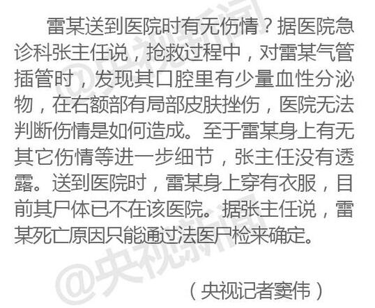 北京市公安局昌平分局昨天通报,5月7日,29岁北京男子雷某因涉嫌嫖娼被控制,期间身体不适身亡。10日,央视记者独家采访救治雷某的昌平中西医结合医院医生,医生表示送医时雷某已无生命体征;有局部皮肤挫伤;死因需待法医尸检确定。