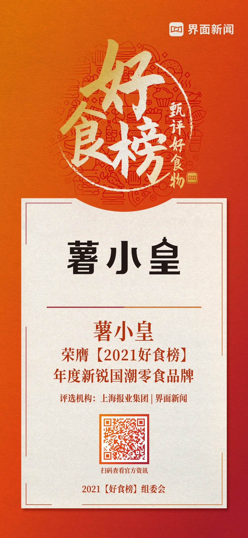 8月5日,上海报业集团l界面新闻在上海静安瑞吉酒店举办了【2021好食榜】颁奖典礼,并正式公布了本年度获奖名单。围绕“甄评好食物”这一核心标准,来自食品行业各细分领域的优秀品牌,在激烈食品消费角逐中夺得了各具特色的年度大奖。薯小皇凭借健康美味的产品和开创食品前沿科技的态度,荣膺【年度新锐国潮零食品牌】大奖。