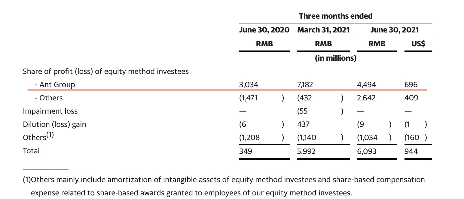 2019年9月起,阿里巴巴选择持有蚂蚁集团33%的股权,并延后一个季度按照权益法核算,计入享有蚂蚁集团的损益份额。