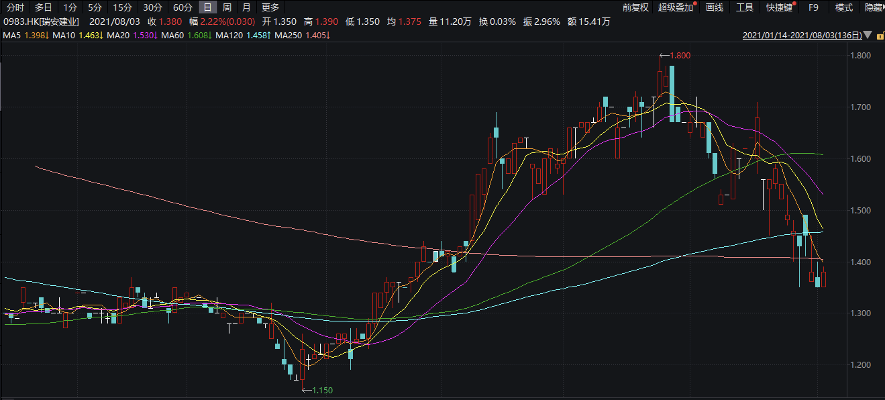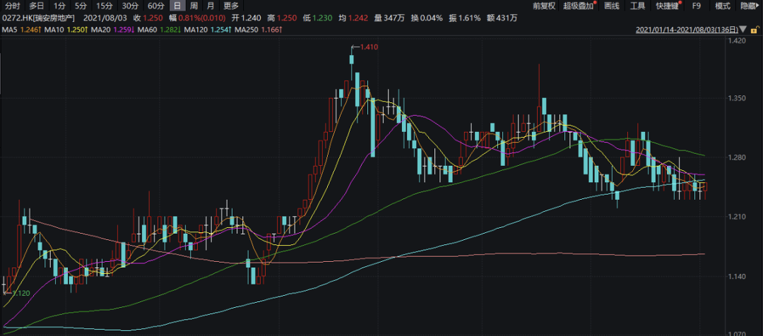 但是,老板的深厚资历与人脉,已然带不动“瑞安系”的股价。瑞安房地产于2006年上市,发行价5.35港元,2007、2008年股价达到每股11港元左右的高峰后,一路下跌,近三年基本上都在2港元/股以下水平浮沉。截至2021年8月3日,该股股价为1.25港元,总市值100.8亿港元。