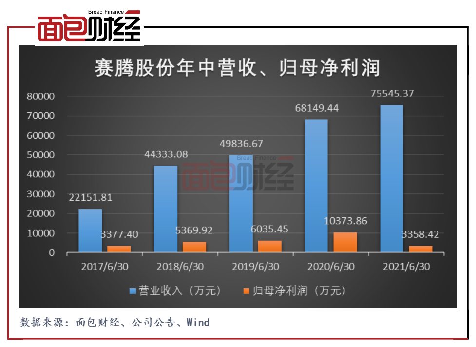 2021年上半年,赛腾股份增收不增利。当期,公司产生营收7.55亿元,同比增加10.85%,并录得归母净利润3358.42万元,同比下降67.63%。
